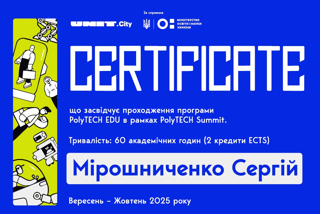 «Навчання в Метінвест Політехніці стало для мене міцним фундаментом для участі у таких проєктах, як PolyTECH EDU. Тут ми не просто вивчаємо технології — ми вчимося мислити як інженери майбутнього, поєднувати науку з практикою й бачити реальний вплив своїх рішень. Підтримка університету мотивує рухатися далі, долучатися до спільнот, де освіта, бізнес і дослідження створюють простір для інновацій. Саме це допомогло мені впевнено представляти Метінвест Політехніку серед найактивніших учасників програми», – зазначає Сергій.