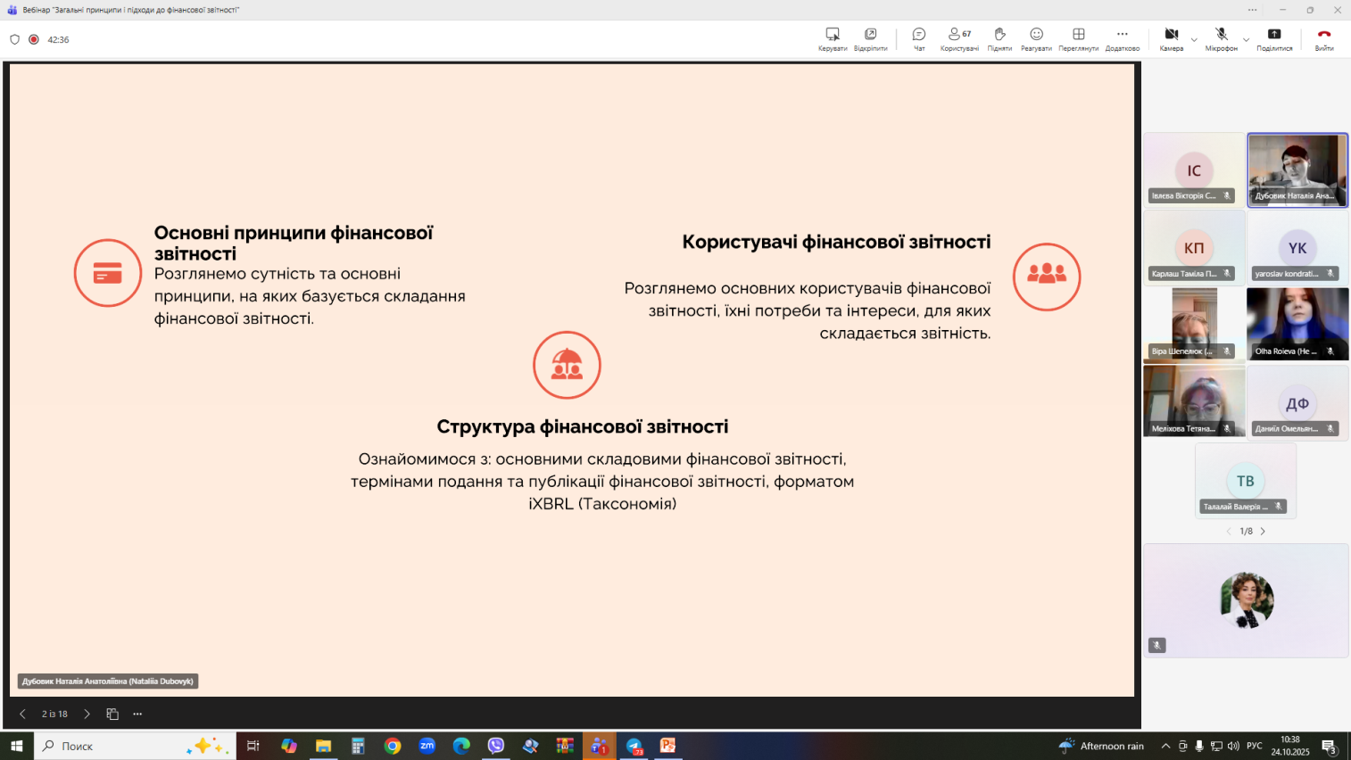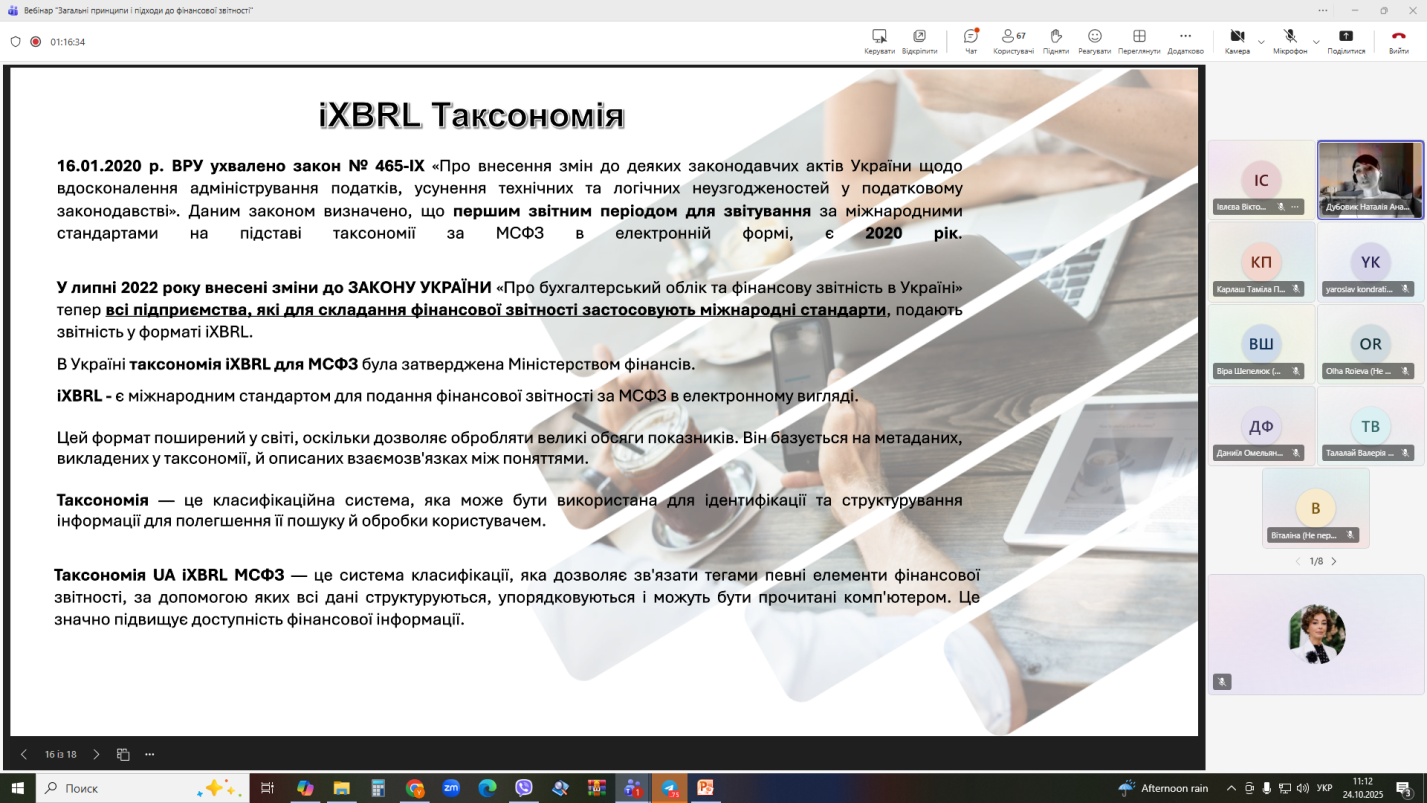 Під час вебінару спікер детально розповіла про роль фінансової звітності у сучасній системі управління підприємством, її значення для прийняття управлінських рішень та взаємодії з інвесторами. Особливу увагу було приділено питанням достовірності показників, впровадженню міжнародних стандартів (МСФЗ) та використанню цифрових інструментів у процесі підготовки звітності.