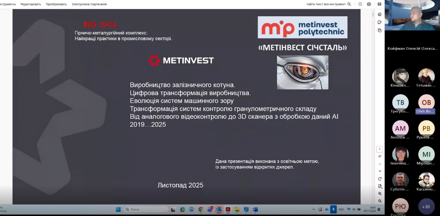 У межах лекції було представлено шлях трансформації від аналогових систем технічного контролю до сучасних рішень на базі IP-камер і Linux-платформи. Олег Бондарь розповів про створення власної бібліотеки з понад 40 000 зображень окатишів, навчання моделі класифікації та інтеграцію з системою управління технологічним процесом. Особливу увагу було приділено оптимізації енергоспоживання, точності розпізнавання та економічній ефективності рішення.